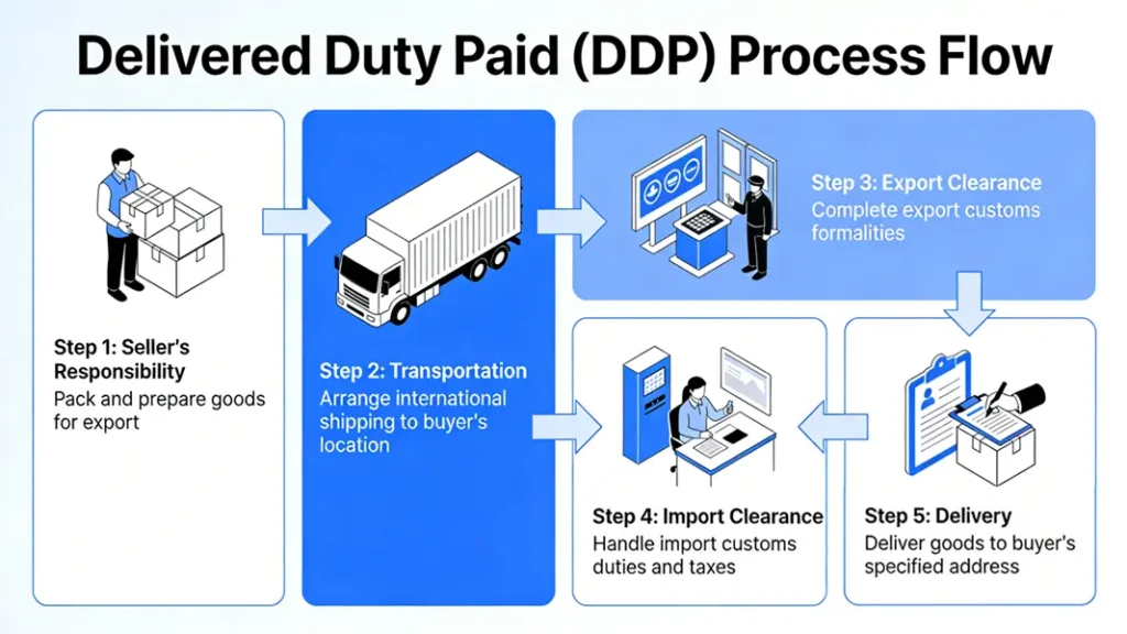 Core Definition : The seller assumes full responsibility and costs from preparation of goods to delivery to the buyer’s designated location, including all import duties, customs clearance, tariffs, and value-added tax. The buyer only needs to receive the goods.
