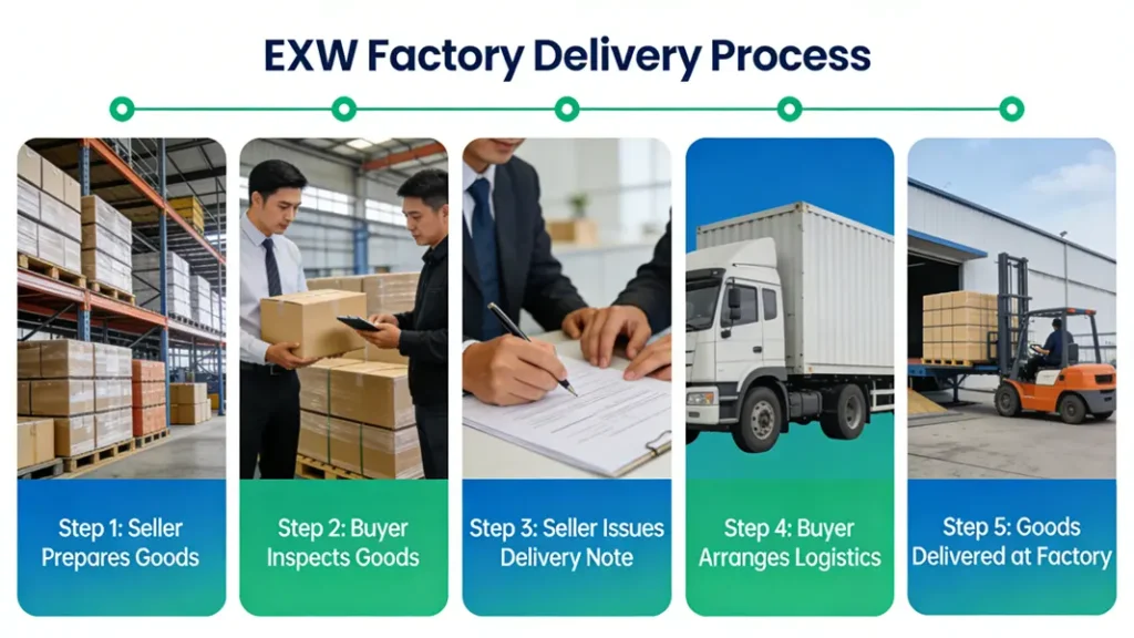 Core Definition : The seller fulfills its delivery obligation when it places the goods at the buyer’s disposal in its own premises (factory, warehouse, or other designated location), and is not responsible for any subsequent stages such as loading, export customs clearance, etc.