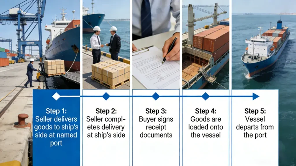 Core Definition : The seller fulfills its delivery obligation by placing the goods alongside the vessel designated by the buyer at the designated port of shipment and completing export customs clearance.