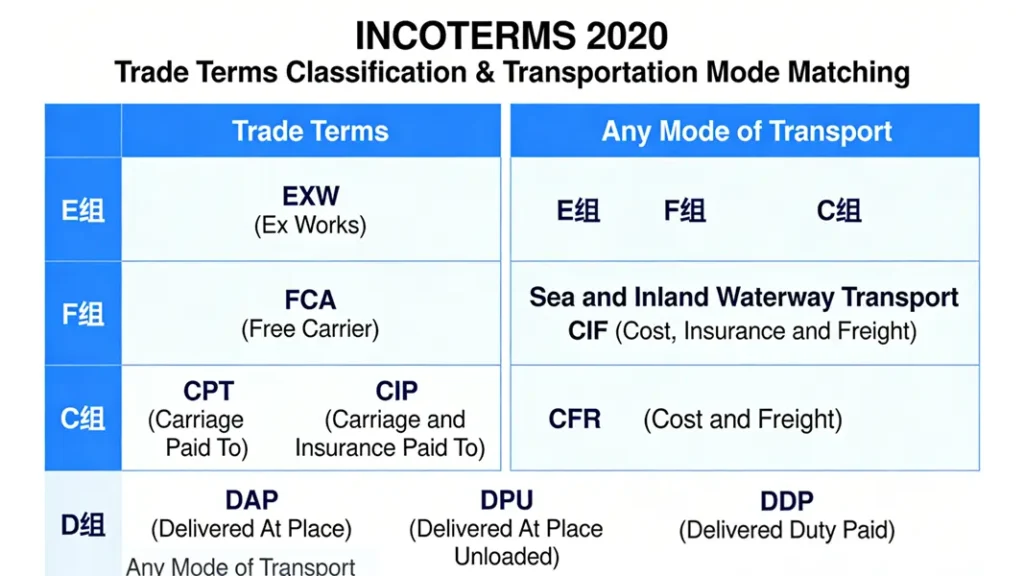 The 11 trade terms in INCOTERMS 2020 are divided into two main categories based on applicable transportation scenarios. These two categories differ significantly in risk transfer logic, delivery scenarios, and applicable cargo types. The specific classifications and core characteristics can be clearly understood using professional diagrams: