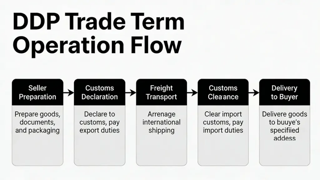 DDP represents the trade term with the heaviest seller responsibility, functioning as a one-stop, door-to-door, all-inclusive transaction model.The seller bears full responsibility for all costs and risks throughout the entire process: from preparing goods at the factory, handling domestic export customs clearance, managing international logistics, and completing import customs clearance in the destination country, to delivering the goods to the buyer’s designated location after paying all applicable taxes and duties. This model suits overseas buyers lacking customs clearance capabilities who seek hassle-free delivery, significantly enhancing cooperation convenience and showcasing the seller’s professional service capabilities.