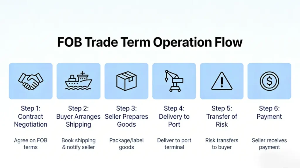 FOB is an extremely common transaction method in cross-border trade. The seller is responsible for transporting the goods to the designated domestic port of shipment and completing loading operations. Risk formally transfers to the buyer once the goods cross the ship’s rail.The seller is solely responsible for domestic export customs clearance, including handling compliance procedures and submitting complete customs documentation. The buyer assumes full responsibility for chartering vessels, booking cargo space, paying ocean freight, purchasing cargo insurance, and managing destination customs clearance and duties. This mature operational model suits exports of bulk and conventional goods.